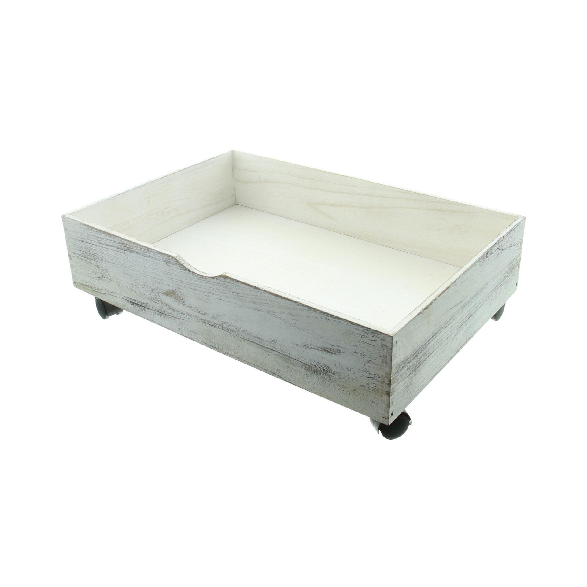 Praktický úložný box z bíle lakovaného dřeva Paulownia, ideální pro uložení lůžkovin, vybaven kolečky pro snadnou manipulaci, 60x40x18 cm