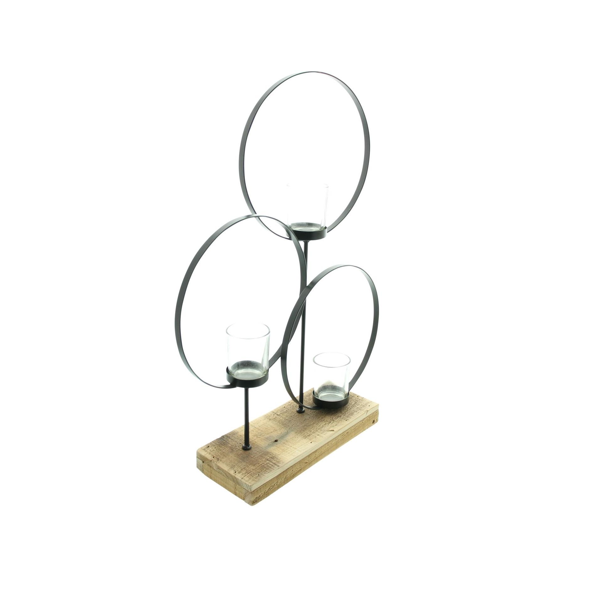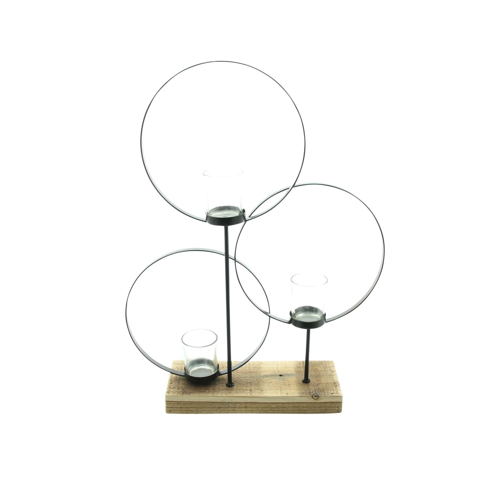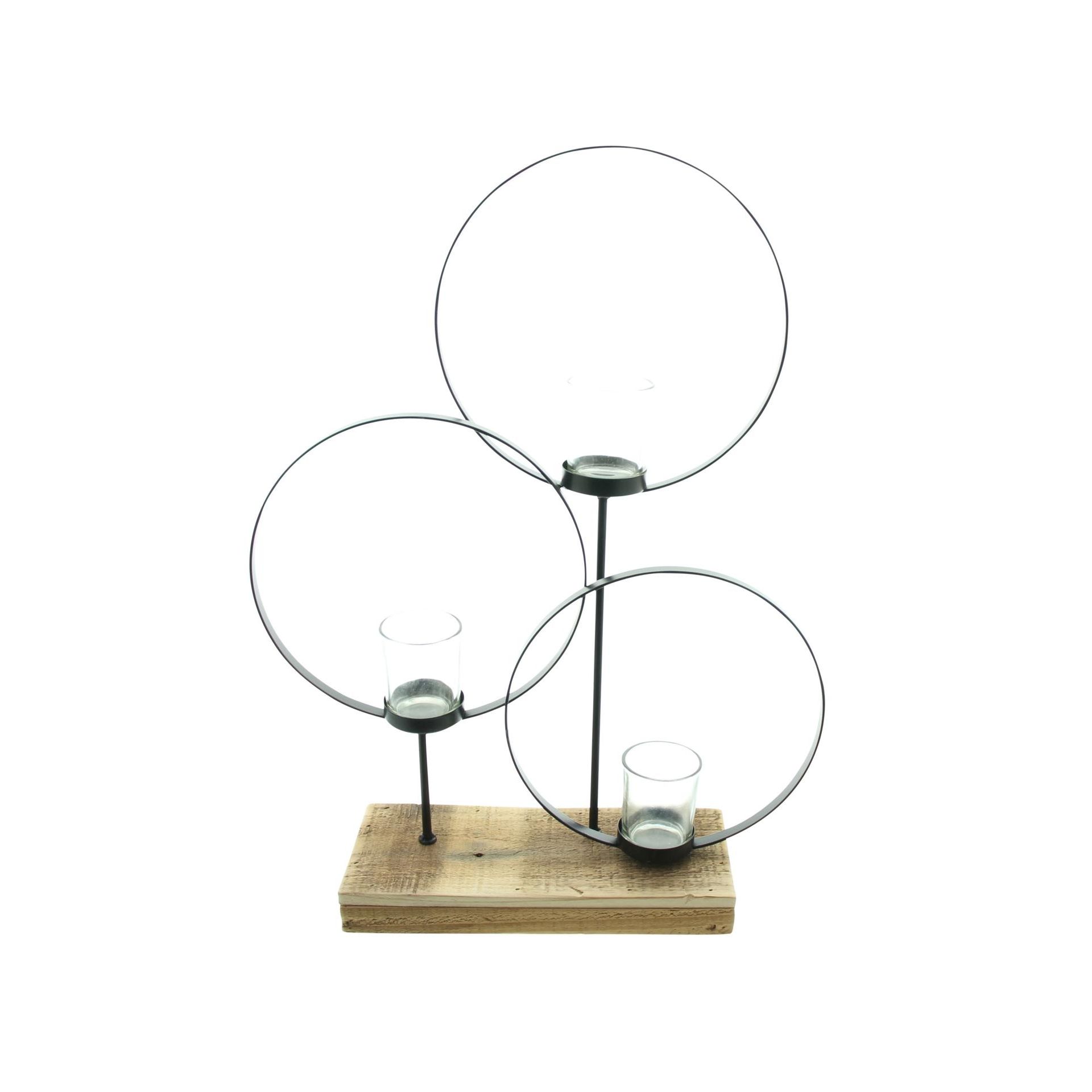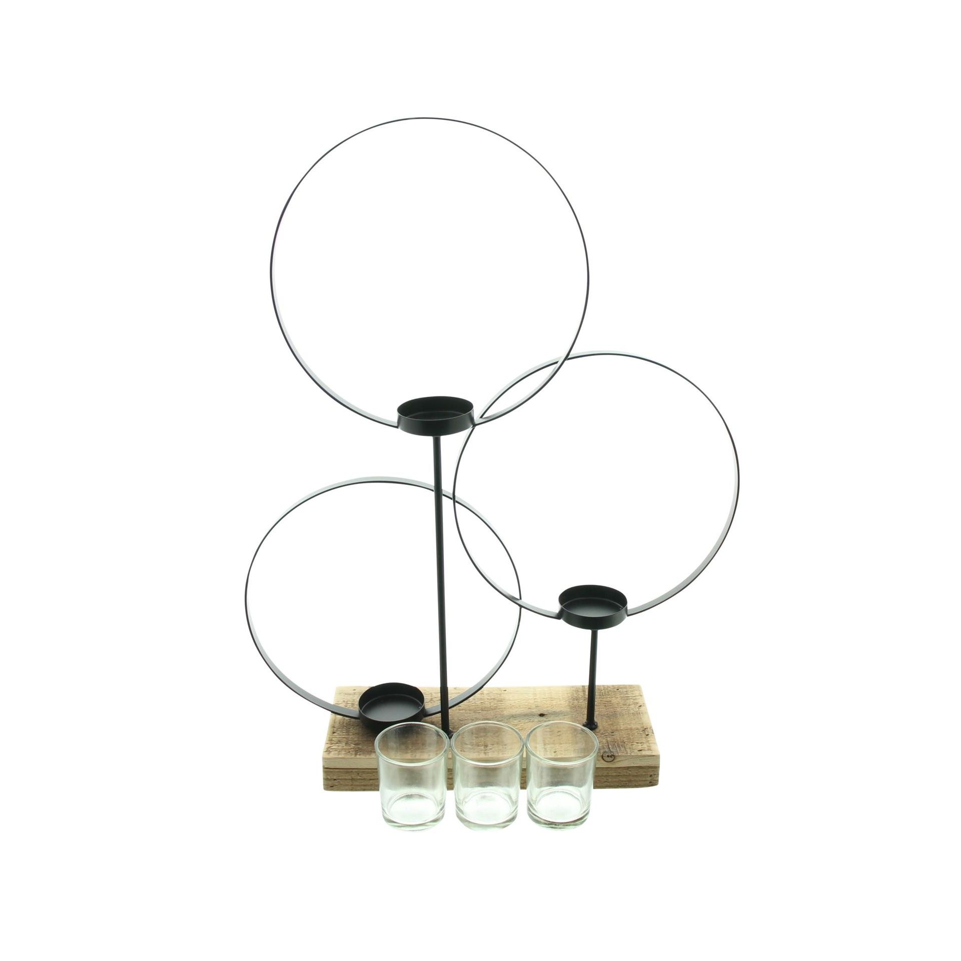 Designový svícen v industriálním stylu, kombinace černého laku a masivního recyklovaného dřeva se 3 vyjímatelnými skly, 35 x 9 x 47 cm