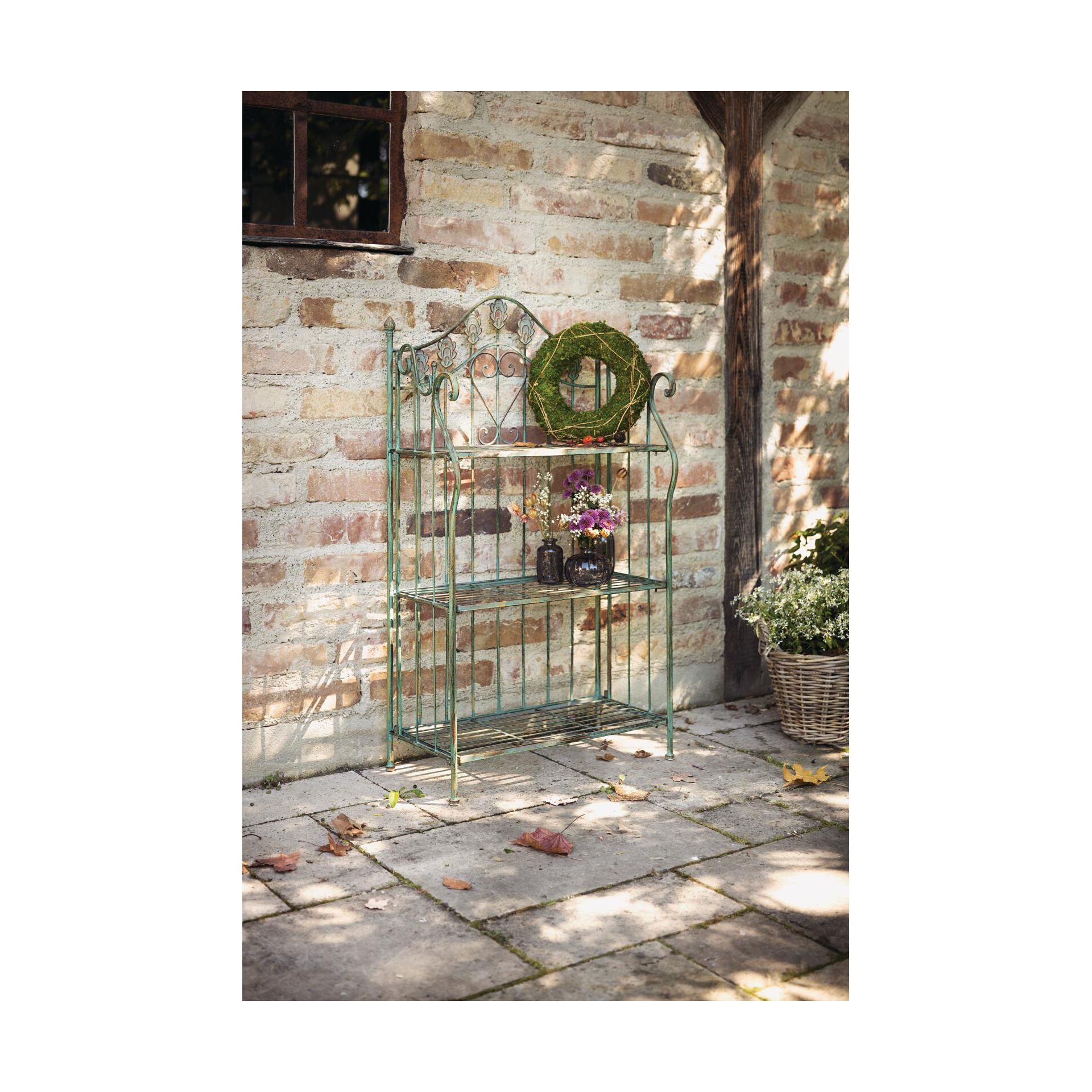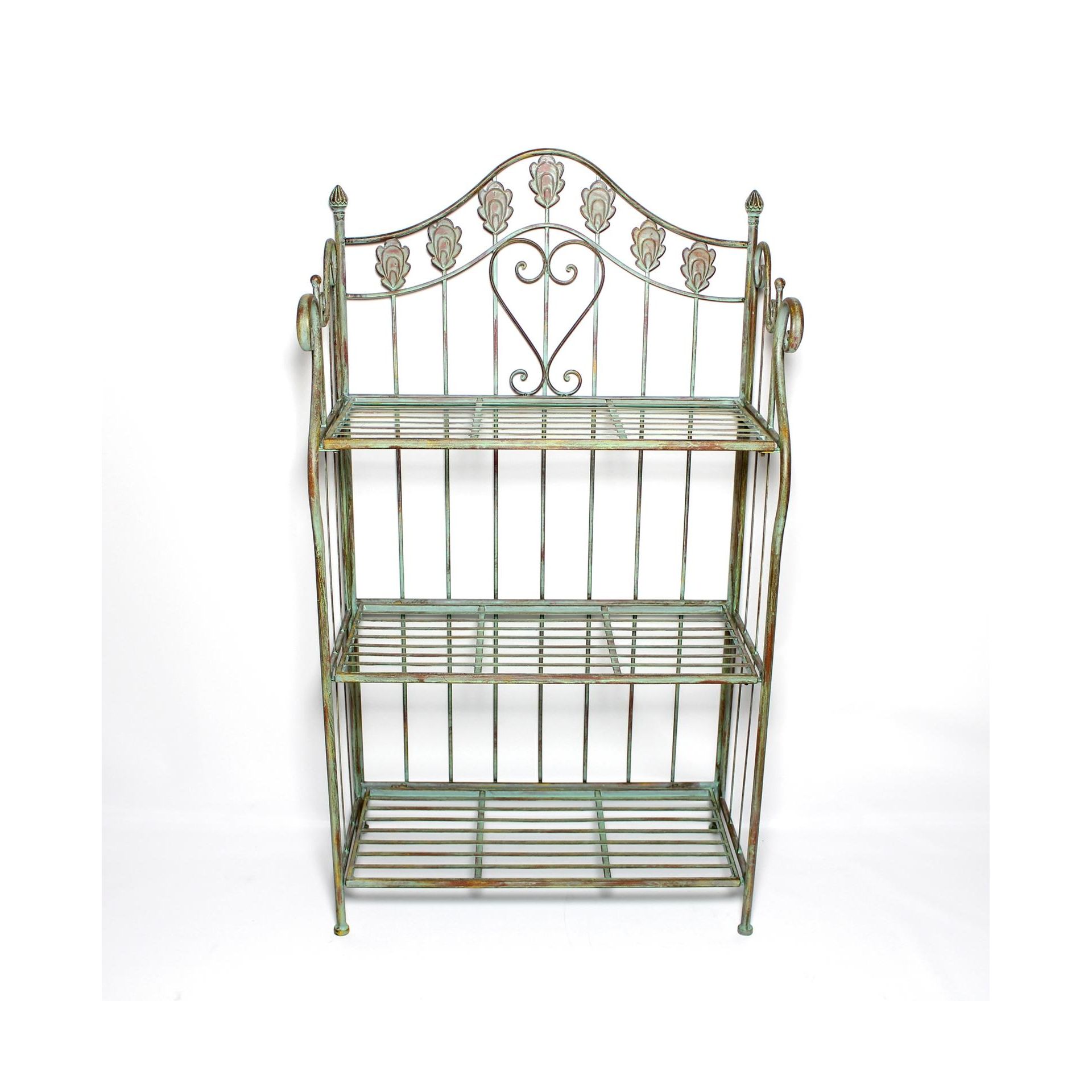 Kovový regál s ikonickým vzorem inspirovaným pavími pery, antik zelená patina, 3 patra, 59 x 30 x 105 cm