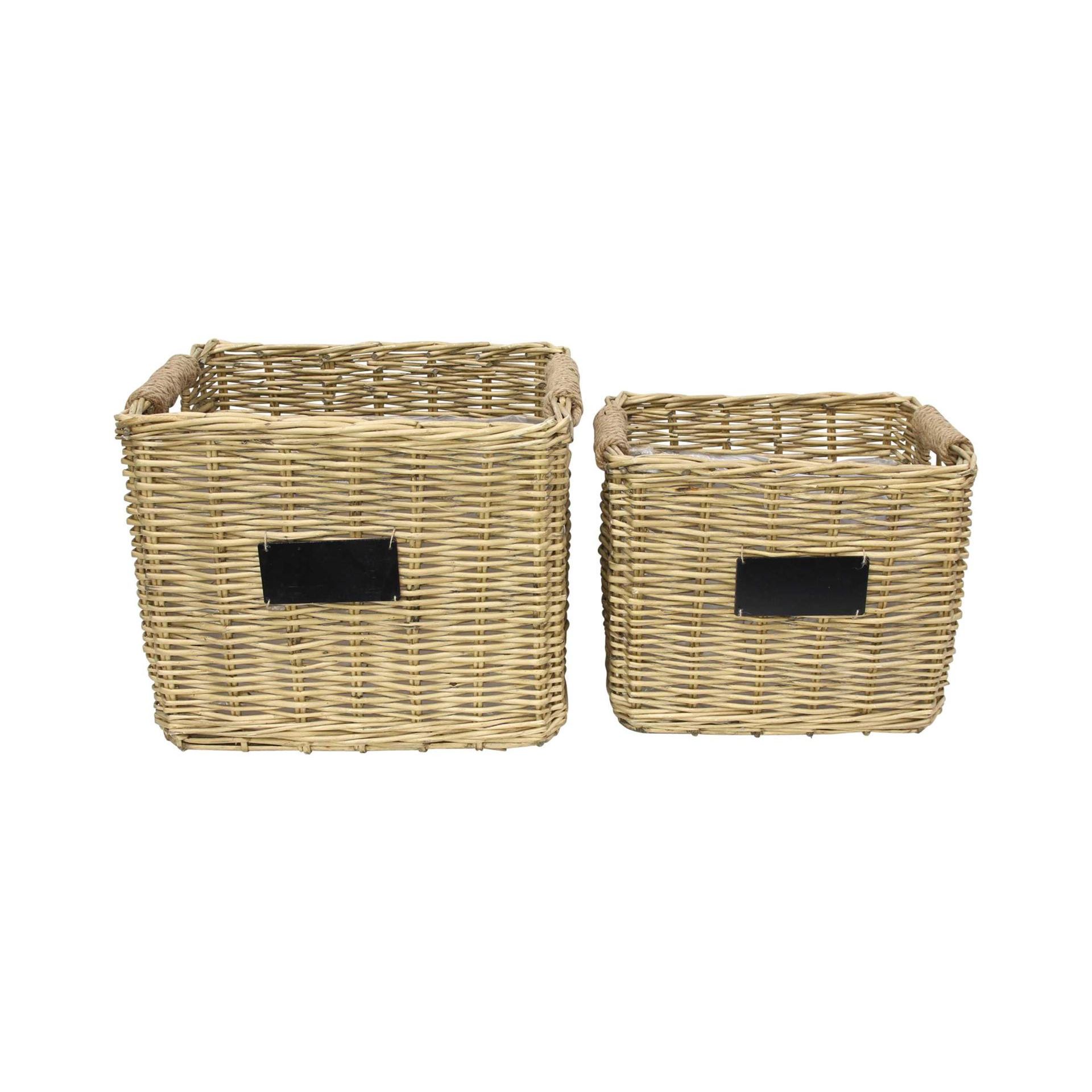 Sada 2 košů z šedé vrby s jutovou šňůrou, tabulka pro vlastní nápis, vybaveno fólií pro přímé osázení, 44 x 31 x 37 cm, 52 x 39 x 43 cm
