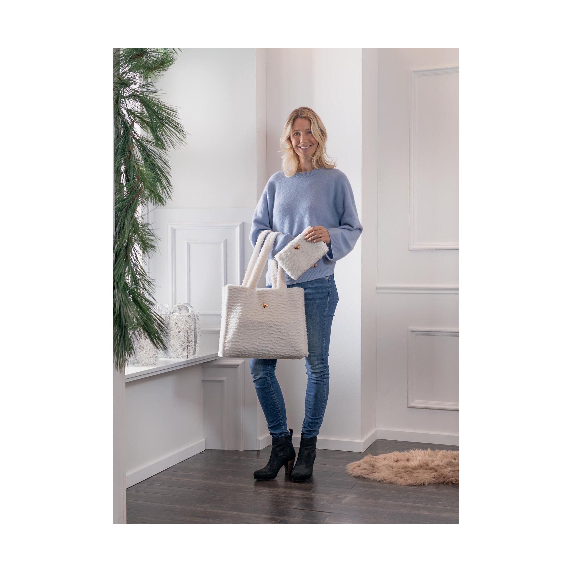 Stylový set v trendovém vzhledu beránka, příruční taška s kosmetickou taškou, zlaté aplikace, měkký a huňatý teddy fleece, 42 x 10 x 32 cm