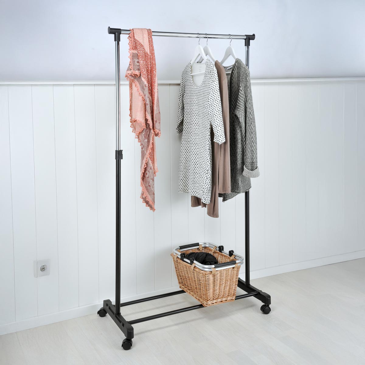 Velkou výhodou je nastavitelná výška v rozmezí cca 90–160 cm, díky čemuž můžete věšák přizpůsobit délce šatů, kabátů i košil.