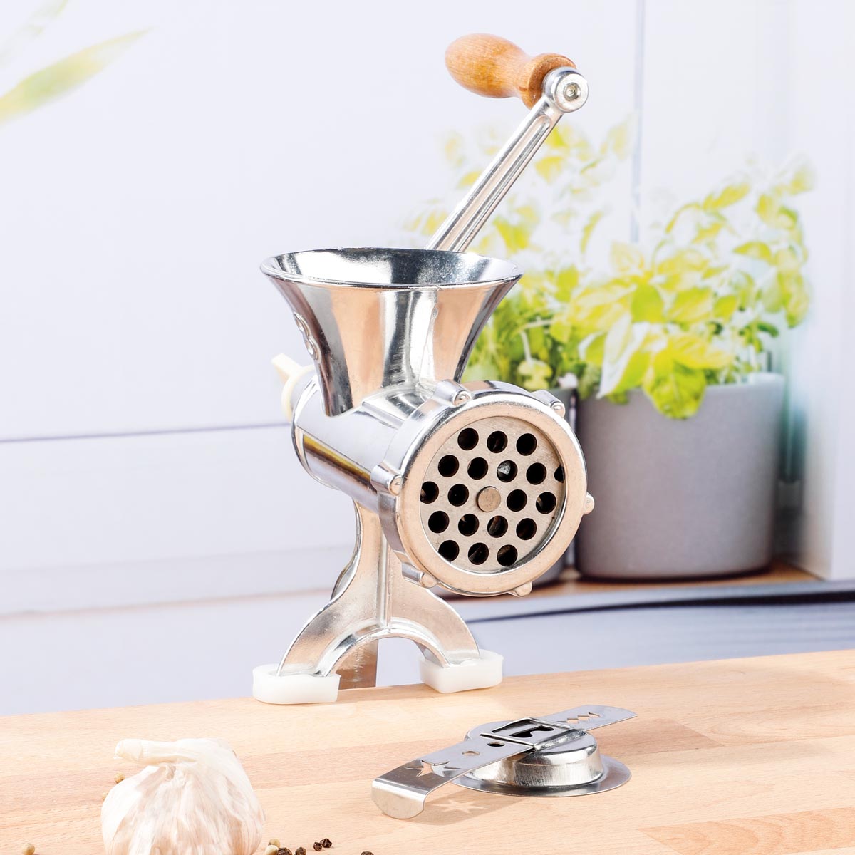Ruční mlýnek na maso vel. 8 z kvalitního hliníku s nerezovým nožem a děrovaným kotoučem. Součástí je nástavec na cukroví. Snadné upevnění ke stolu…