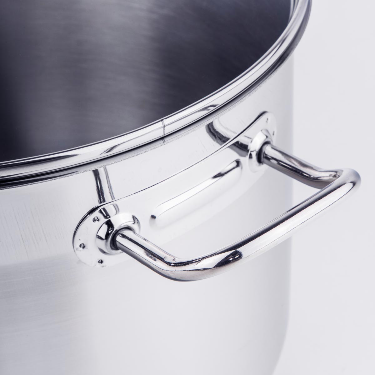 Hrnec je vyroben z kvalitní nerezové oceli – horní část je leštěná, zatímco spodní část má elegantní kartáčovanou matnou úpravu. Kombinace těchto povrchů dodává nádobí atraktivní vzhled i vyšší odolnost proti opotřebení.