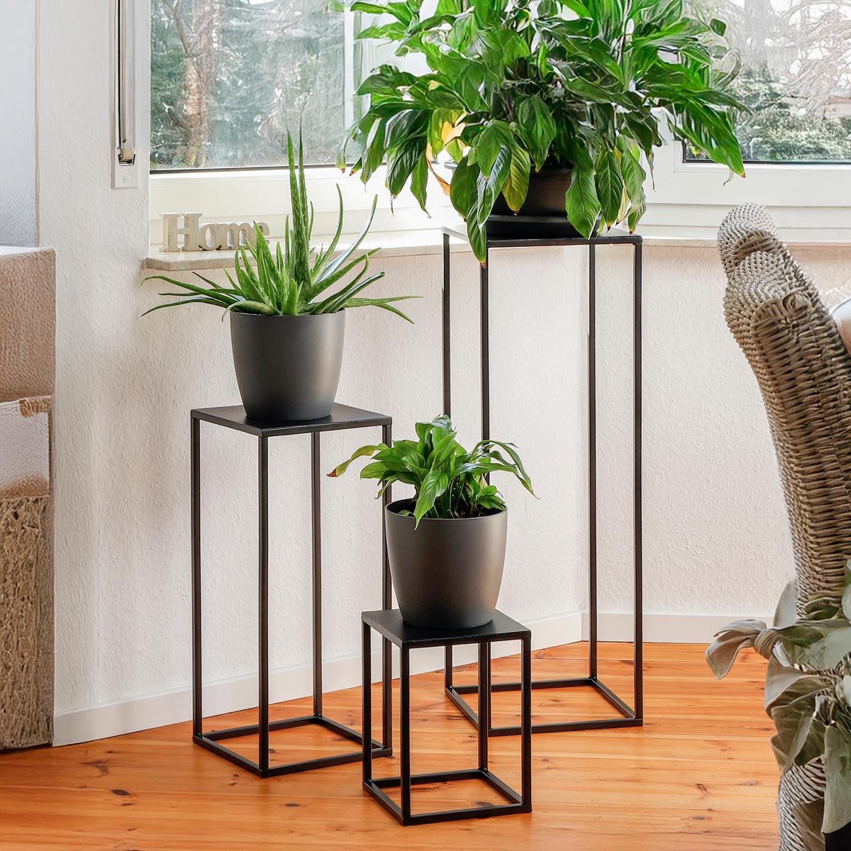 3dílná sada kovových podstavců na květiny v černém minimalistickém designu. Různé výšky stojanů (30 cm, 60 cm a 90 cm) umožňují vytvořit atraktivní…