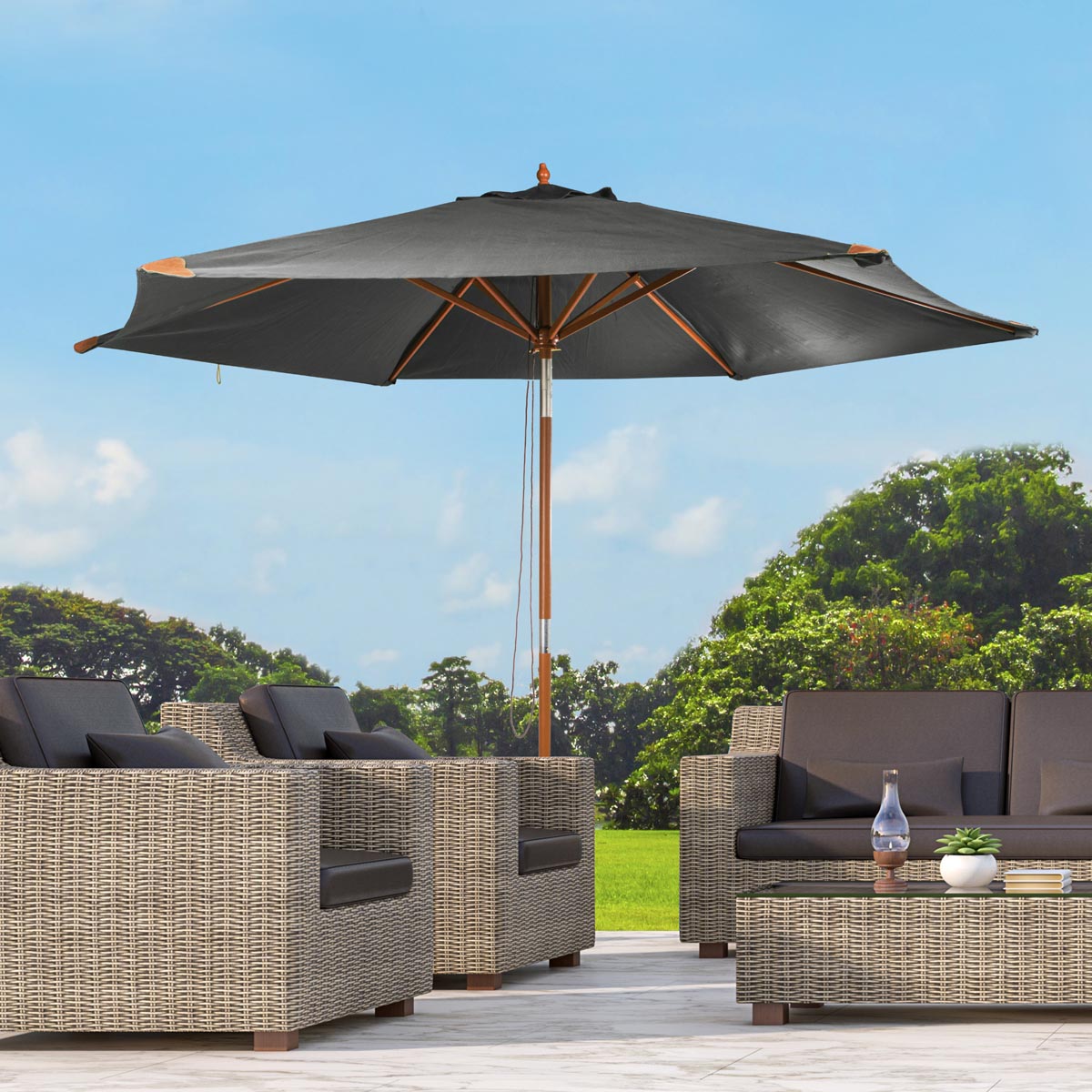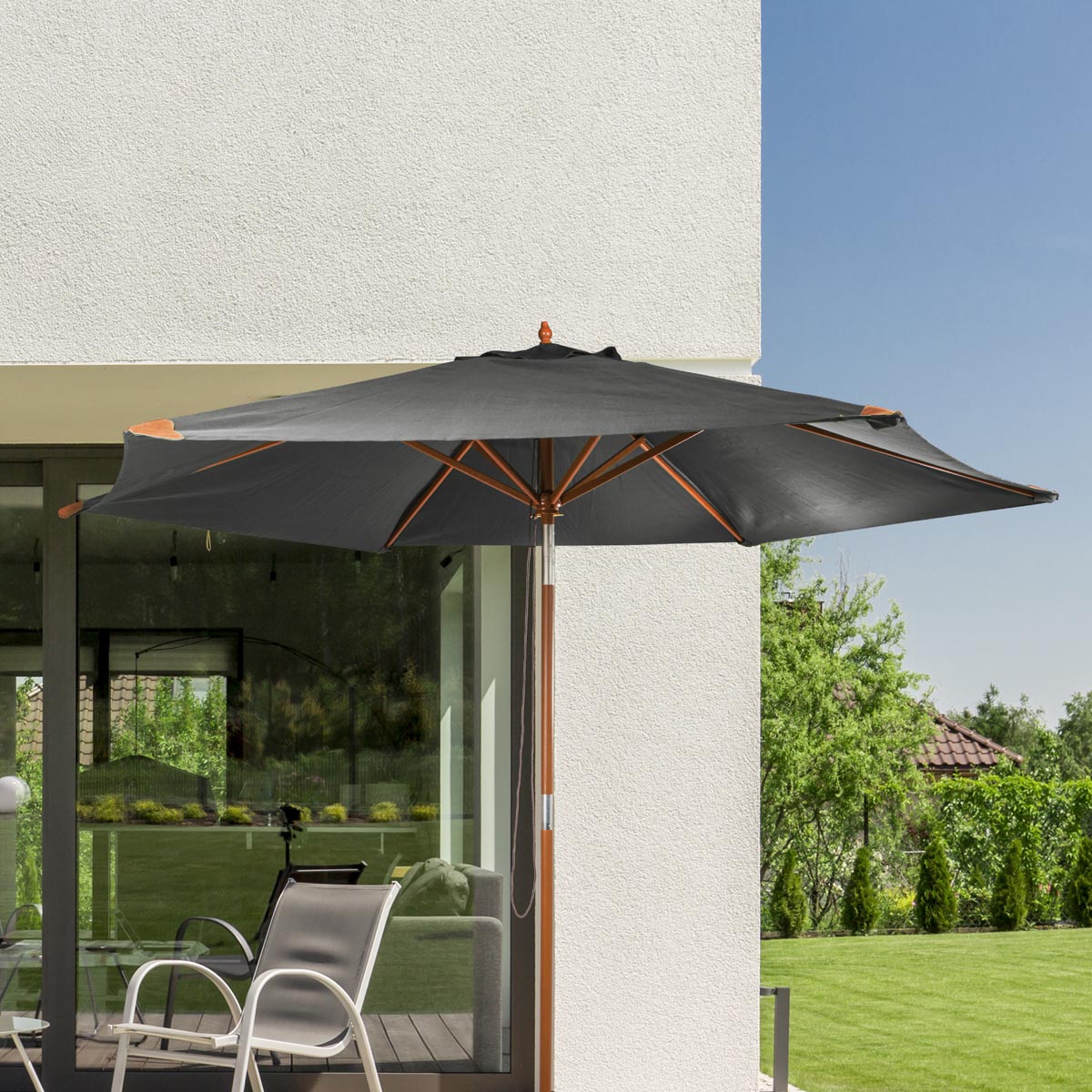 Stylový dřevěný slunečník s průměrem 300 cm je perfektním doplňkem pro každé venkovní posezení.